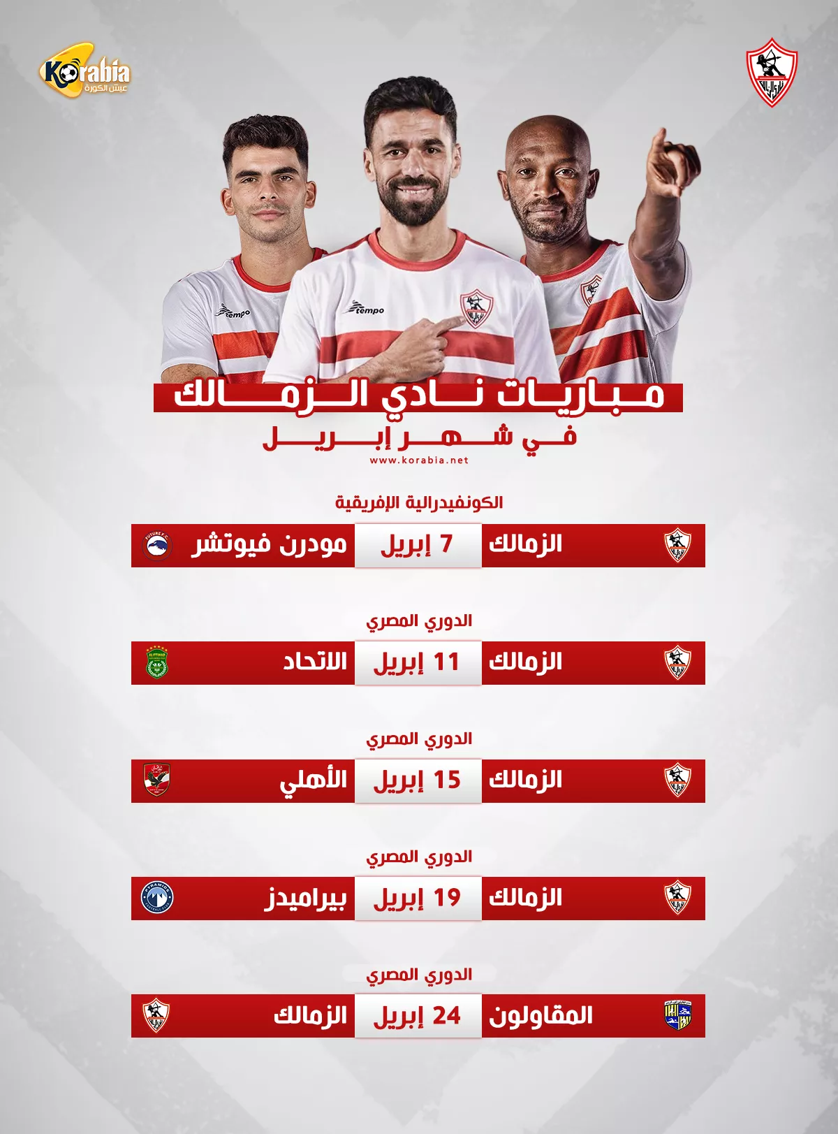 ويرصد كورابيا في السطور التالية، جميع مواجهات ومواعيد مباريات الزمالك في شهر إبريل، والتي جاءت على النحو التالي:
