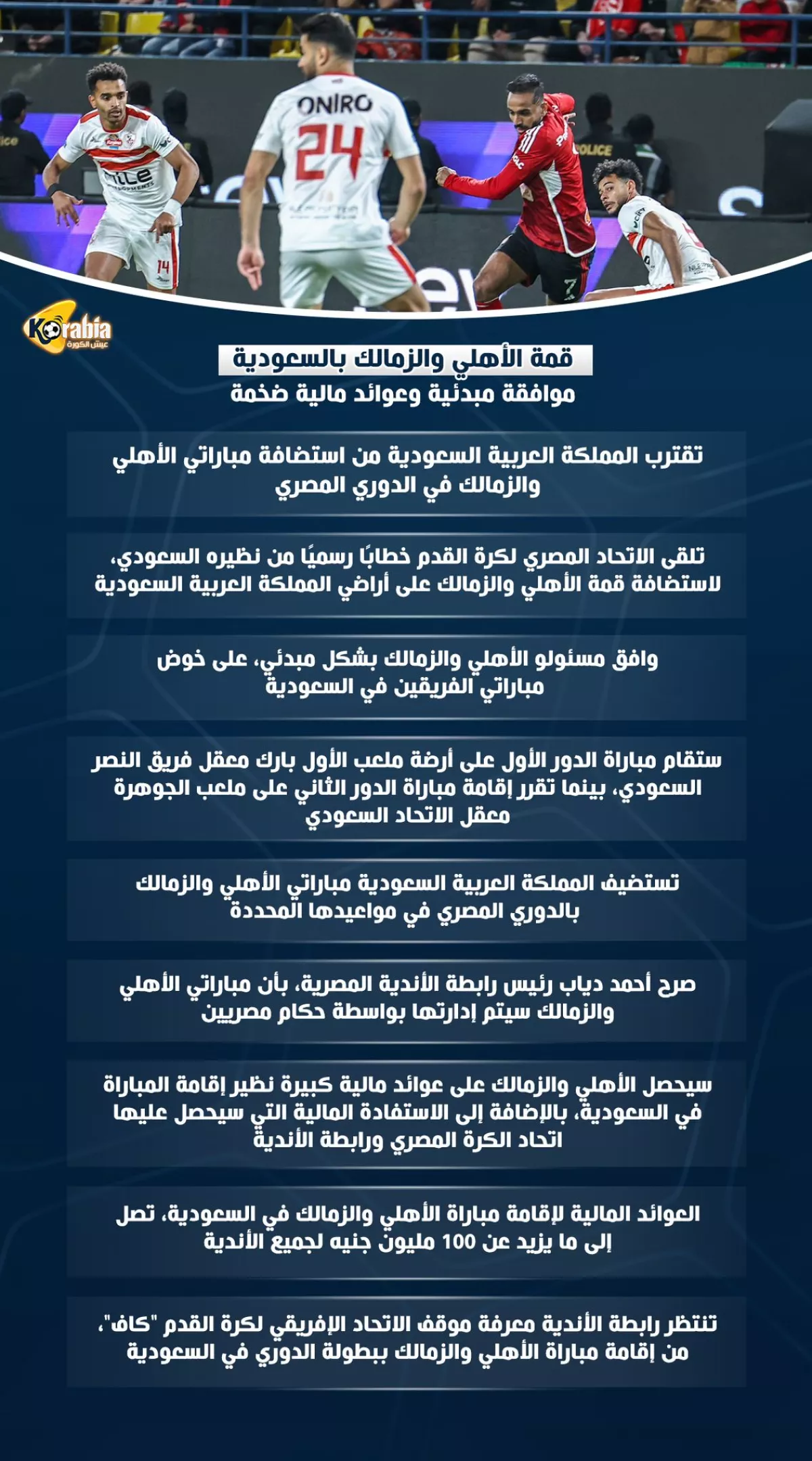 - تقترب المملكة العربية السعودية من استضافة مباراتي الأهلي والزمالك في الدوري المصري.